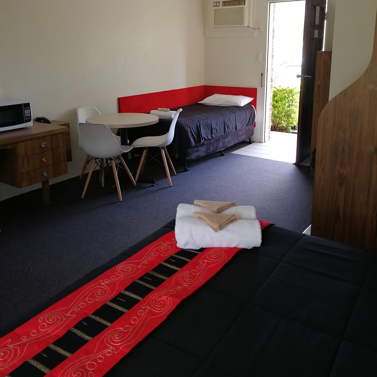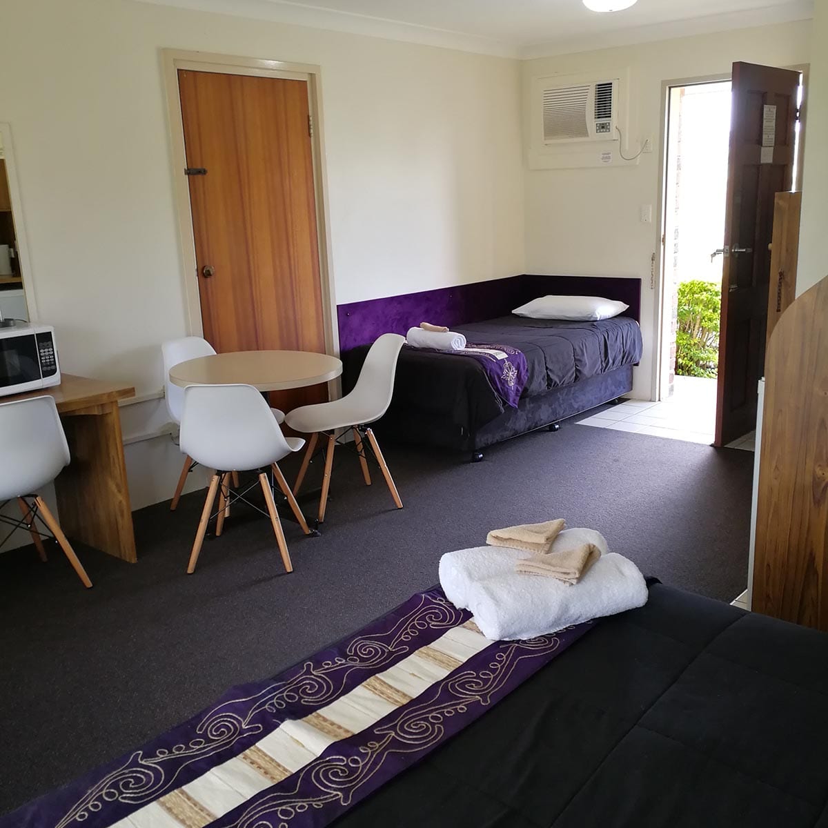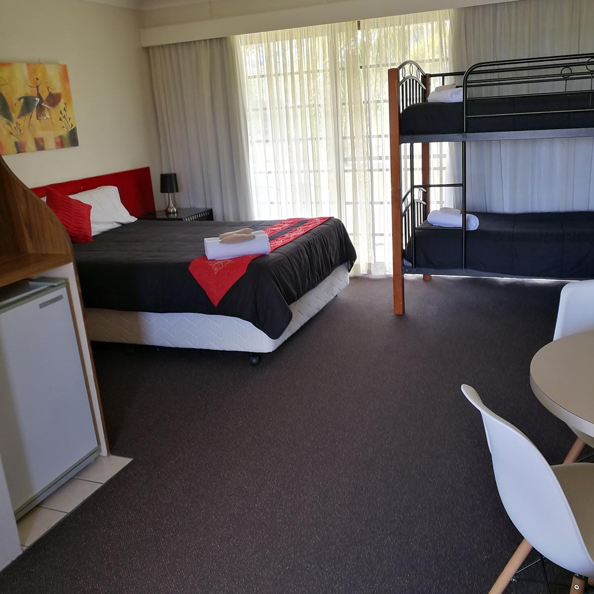 Air-conditioned room with queen bed, single bed and bunks, wifi, dining area, tea and coffee facilities, toaster, microwave, in room safe, ensuite with amenities and private terrace. Basic cutlery and plates.