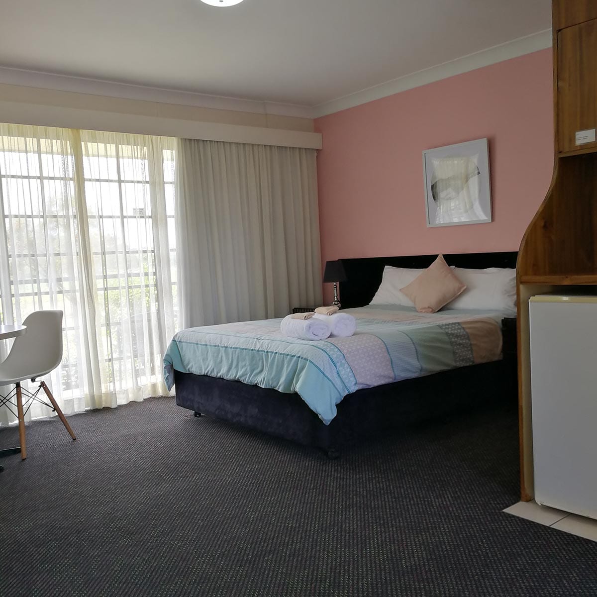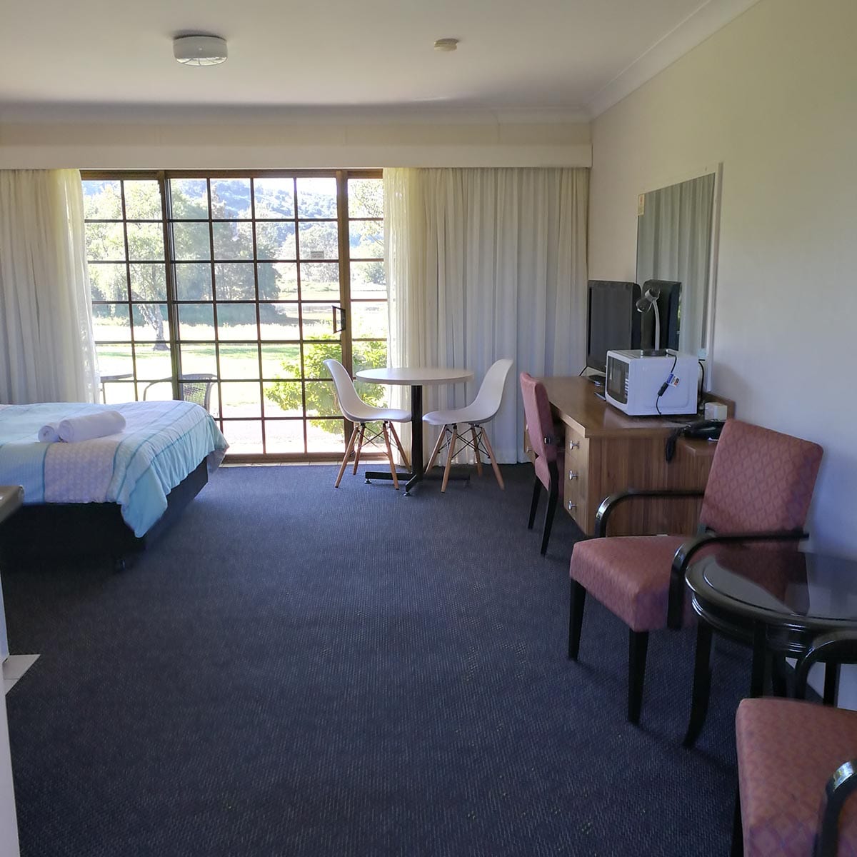 Air-conditioned room with queen bed, wifi, dining area, seating area, tea and coffee facilities, toaster, microwave, in room safe, ensuite with amenities and private terrace.