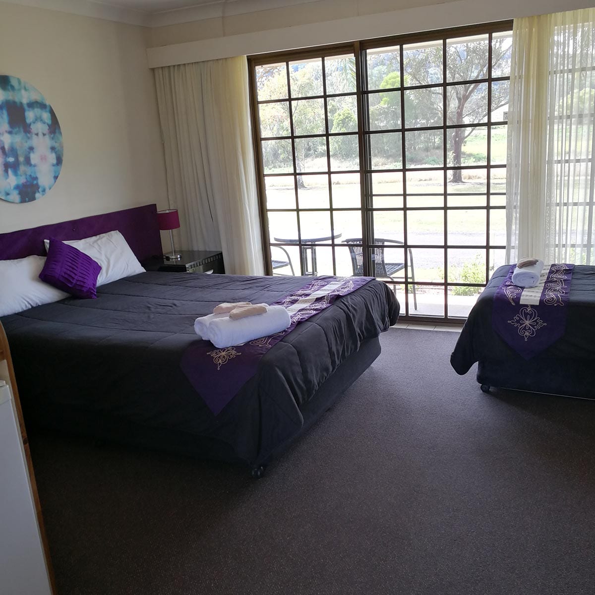Air-conditioned room with queen bed and two singles, wifi, dining area, tea and coffee facilities, toaster, microwave, Foxtel, in room safe, ensuite with amenities and private terrace.
